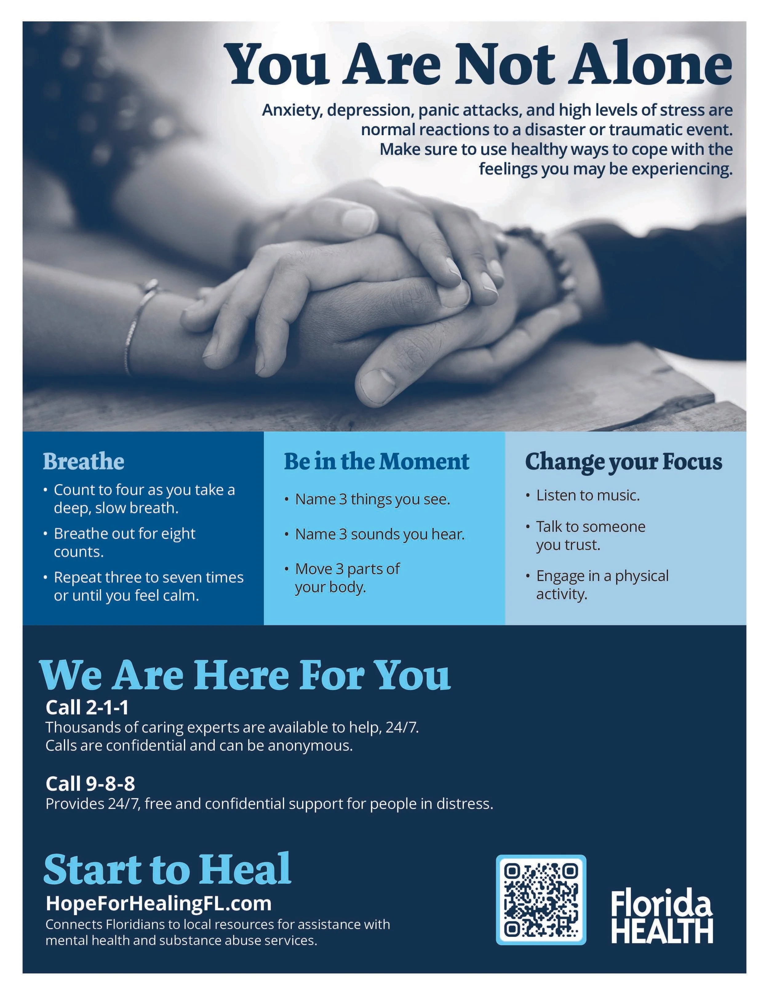 Florida Department of Health in Escambia and Santa Rosa Counties provide mental wellbeing programs and resources such as 988 Crisis Lifeline, 2-1-1, Hope for Healing, Resiliency and Mental Health, and Children’s Mental Health. For more information click on the links above for the respective counties.